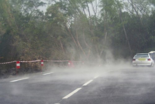 Avec la pluie, la lave encore chaude dégage de la vapeur